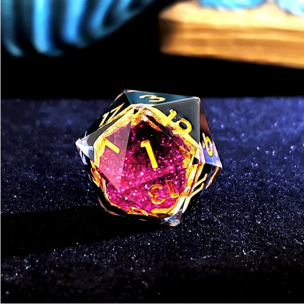 Step into a new dimension of gaming with the Demiplane polyhedral dice set, where enchanting magenta sparkle-infused inclusions meet expertly honed sharp edges and gold numerals.